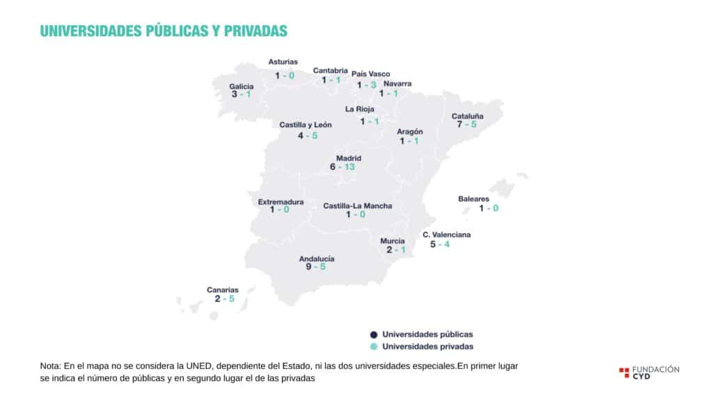 La Comunidad de Madrid encabeza la lista por número de universidades con 19 (6 públicas y 13 privadas), seguida por las 14 de Andalucía (9 públicas y 5 privadas) y las 12 de Cataluña (7 públicas y 5 privadas).  En la última década, donde más universidades privadas se han creado ha sido en la Comunidad de Madrid, Andalucía y Canarias.