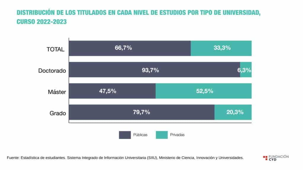 En el curso 2022-2023, el 79,7% de los titulados de grado procedía de las universidades públicas, y el 52,5% de los de máster de las universidades privadas, mientras que el 93,7% de los doctorados obtenía su título en una universidad pública.