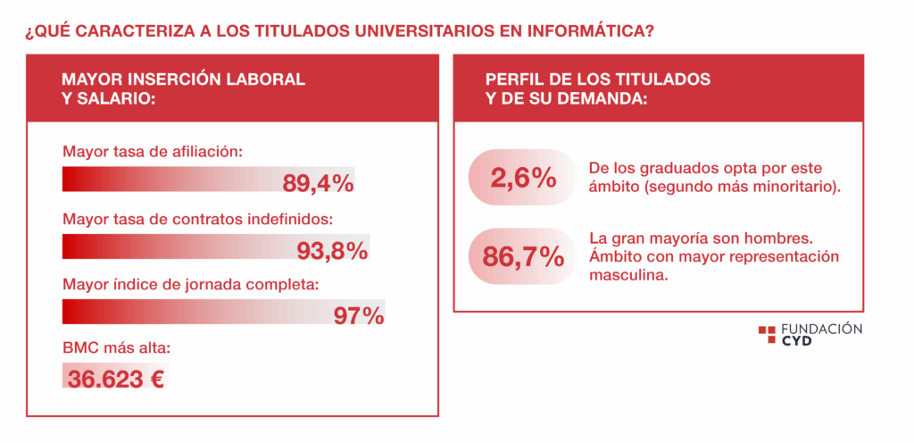 Informática destaca por ser el ámbito con mejores indicadores en inserción laboral: sus egresados registran, cuatro años después de obtener el título, los mejores resultados en tasa de afiliación a la Seguridad Social (89,4%) y la base media de cotización más elevada (36.623 €). A pesar de sus buenos resultados, este ámbito sigue siendo minoritario (en el curso 2018-2019 egresaron 4.847 personas, lo que supone un 2,6% sobre el total), especialmente entre las mujeres, que sólo representan un 13,3% del alumnado.