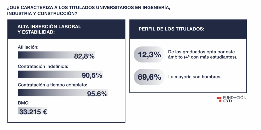 En el curso 2018-2019 egresaron en España 23.338 estudiantes de titulaciones universitarias vinculadas al ámbito de Ingeniería, industria y construcción y, cuatro años después, en 2023, presentaban muy buenos resultados en inserción laboral: la gran mayoría que trabajaba por cuenta ajena tenía un contrato indefinido (90,5%) y la base media de cotización salarial era de 33.215 €.