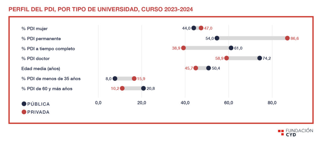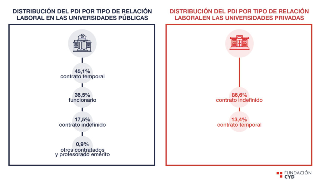 Según datos del curso 2023-2024, a nivel global, el 56,7% del PDI trabaja a tiempo completo, y el 60,3% tiene plaza estable. En las públicas, el 61% trabaja con dedicación completa, pero menos del 55% forma parte de la plantilla permanente. En las privadas, en cambio, menos del 40% trabaja a tiempo completo, pero más del 85% tiene contrato indefinido.