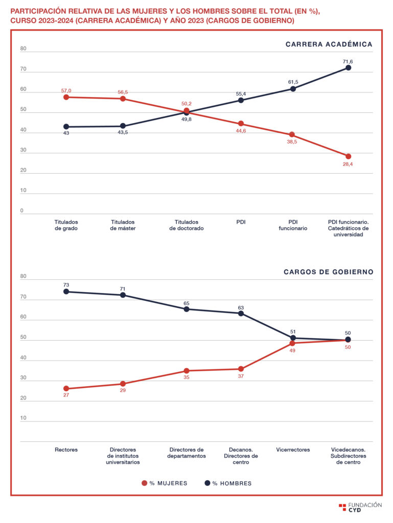 Las mujeres representan el 44,6% del total del PDI, una cifra que ha crecido ligeramente (3,7 puntos porcentuales) respecto al curso 2015-2016. Si bien se observa que en las etapas iniciales de la carrera académica hay paridad entre hombres y mujeres, a medida que avanza el nivel profesional, la presencia de ellas disminuye: las mujeres ocupan menos del 35% de las cátedras y, en los cargos de gobierno, solo representan el 27% de los rectorados. También hay una presencia desigual en función de los ámbitos de conocimiento: hay una alta presencia de PDI femenino en Educación y Salud (más del 50%), pero una presencia menor en áreas como Ingeniería (25,7%) e Informática (20%), una polarización que se está ampliando desde el curso 2015-2016. Montse Álvarez apunta algunas propuestas que pueden ayudar a revertir estas cifras:
