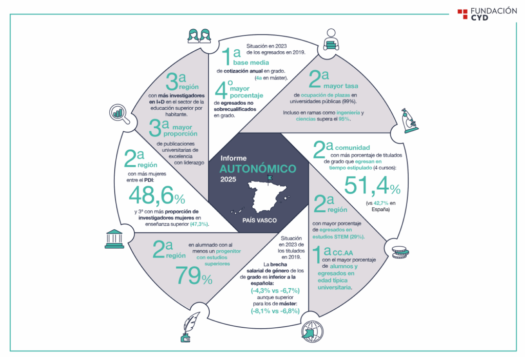 El informe Las universidades españolas. Una perspectiva autonómica. 2025 analiza el contenido del Informe CYD 2024 desglosado por comunidades autónomas y universidades de cada región. Este artículo destaca las características del sistema universitario presencial del País Vasco.